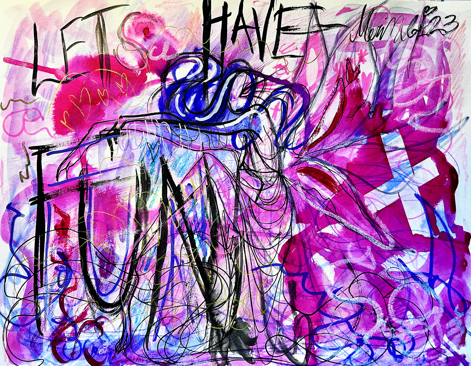 This mixed media piece of chaos, crayons, markers, and ink, is a manifestation of turning off my nagging brain and literally being open to all the possibilities presented to me. The idea of perfection is irrelevant.